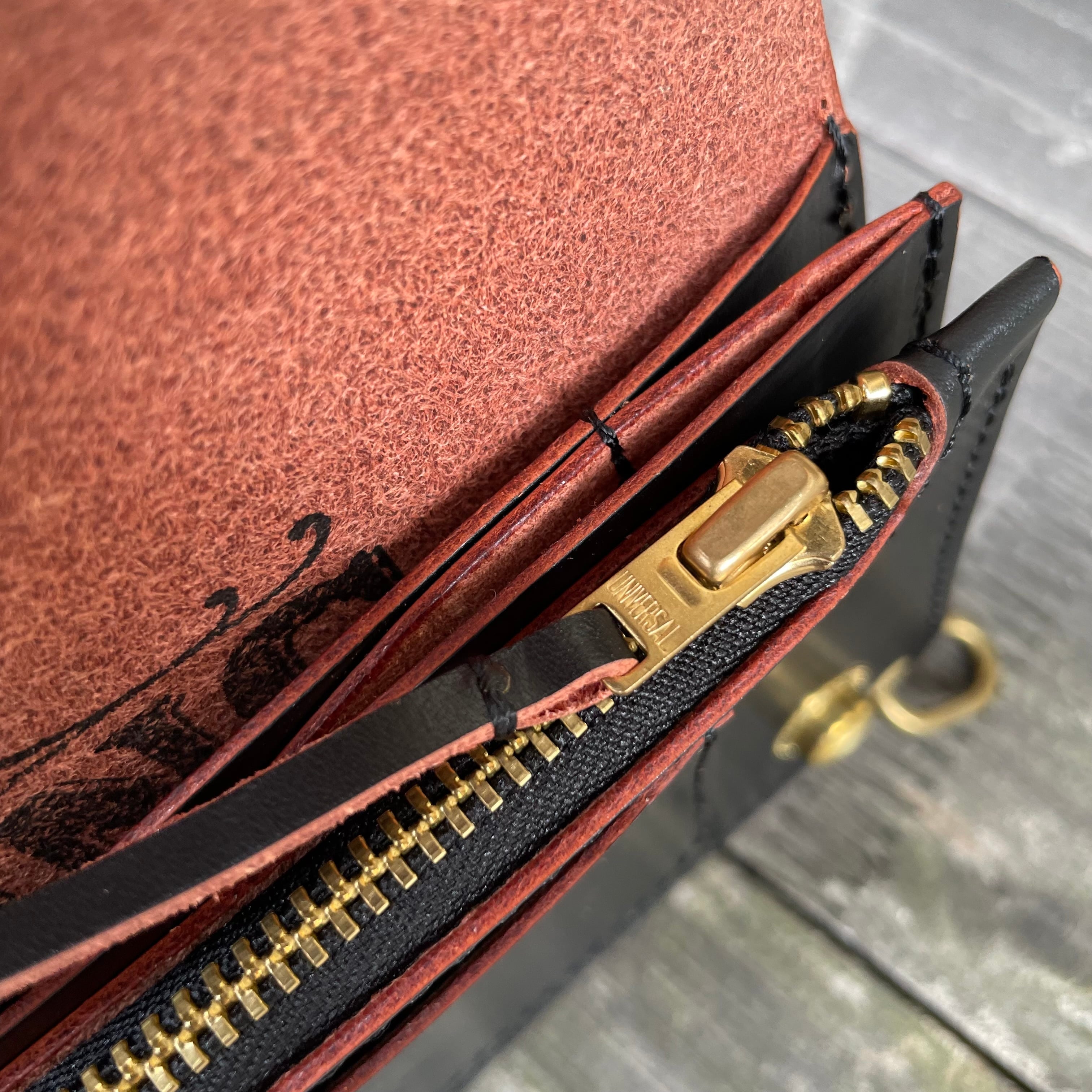 ディテールはシンプルな3層構造になっており、手前にコインケースが有り、さらにカードを独立収納出来るケースが付いております。札入れ用ポケットが2つあり、お札・レシート・メモなどの収納が可能となっております。